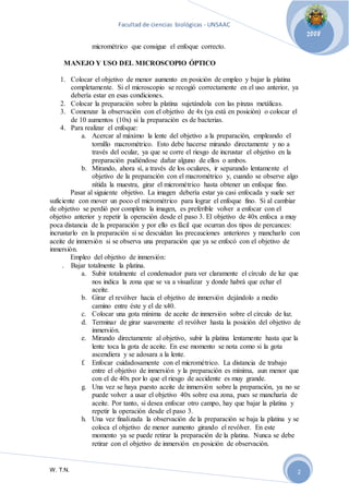 El documento describe las partes y el uso de un microscopio óptico, incluyendo el sistema óptico, sistema mecánico, objetivos, platina, tornillos de enfoque y más. Explica cómo preparar y observar muestras usando gotas y gotas pendientes, y concluye con ejemplos de protozoarios.
