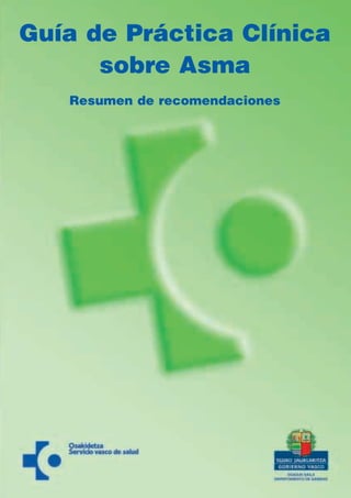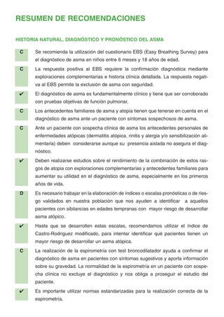 El documento proporciona recomendaciones sobre el diagnóstico, tratamiento y manejo del asma. Algunas de las recomendaciones clave incluyen: utilizar el cuestionario EBS para diagnosticar asma en niños entre 6 meses y 18 años; los corticoesteroides inhalados son el tratamiento preventivo recomendado para el asma leve persistente en niños y adultos; y se debe enseñar a los pacientes a usar correctamente los inhaladores para asegurar la administración adecuada de la medicación.