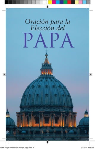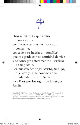 Este documento contiene una oración para la elección del Papa. La oración le pide a Dios que conceda a la Iglesia un pontífice que sea santo y se dedique enteramente al servicio de su pueblo. Finalmente, la oración concluye alabando a Dios por los siglos de los siglos.