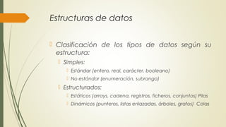 Este documento describe diferentes tipos de estructuras de datos, incluyendo tipos de datos simples y estructurados, así como estructuras de datos específicas como arrays unidimensionales, matrices bidimensionales, pilas y colas. También explica dos algoritmos de ordenación: el método de la burbuja y el método de inserción.