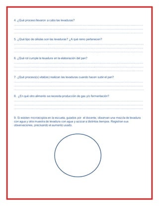 Este documento presenta un experimento para observar el crecimiento de levaduras. Se disuelve levadura y azúcar en agua caliente y se coloca la mezcla en una botella con un globo en la boca. A medida que las levaduras fermentan el azúcar, producen dióxido de carbono que infla el globo. Las levaduras son células unicelulares que pertenecen al reino de los hongos y juegan un papel importante en la elaboración de pan al producir gas durante la fermentación.