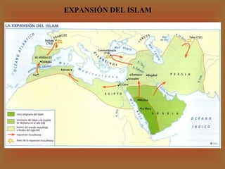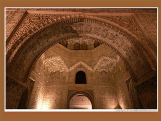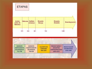 El documento describe la expansión del Islam en la Península Ibérica durante diferentes periodos históricos como el Califato, Taifas, Almorávide y Almohade. Incluye información sobre la arquitectura islámica en España y Oriente Próximo, con detalles sobre elementos arquitectónicos como la mezquita, el palacio, y ejemplos notables como la Mezquita de Córdoba y la Alhambra de Granada.