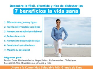 El documento promueve una vida saludable a través de la actividad física, la alimentación saludable y una actitud positiva. Señala que adoptar este estilo de vida puede prevenir enfermedades, aumentar el rendimiento laboral, reducir el estrés, mejorar el desempeño sexual y combatir el estreñimiento. También presenta el caso de éxito de César Cardoso, quien perdió 15 kilos en 9 semanas siguiendo el programa de alimentación de getUP!. El documento invita a unirse a la comunidad sal