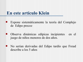 Klein describe las etapas tempranas del Complejo de Edipo, observando dinámicas edípicas en niños menores de 2 años. Explica que tanto niños como niñas experimentan inicialmente un Edipo positivo hacia la madre, pero luego se diferencian: las niñas desarrollan envidia fálica hacia el padre, mientras que los niños pasan por una fase femenina frustrada de identificación con la madre. Ambos sexos eventualmente regresan a un segundo Edipo positivo, pero persisten diferencias motivadas por la presencia o a