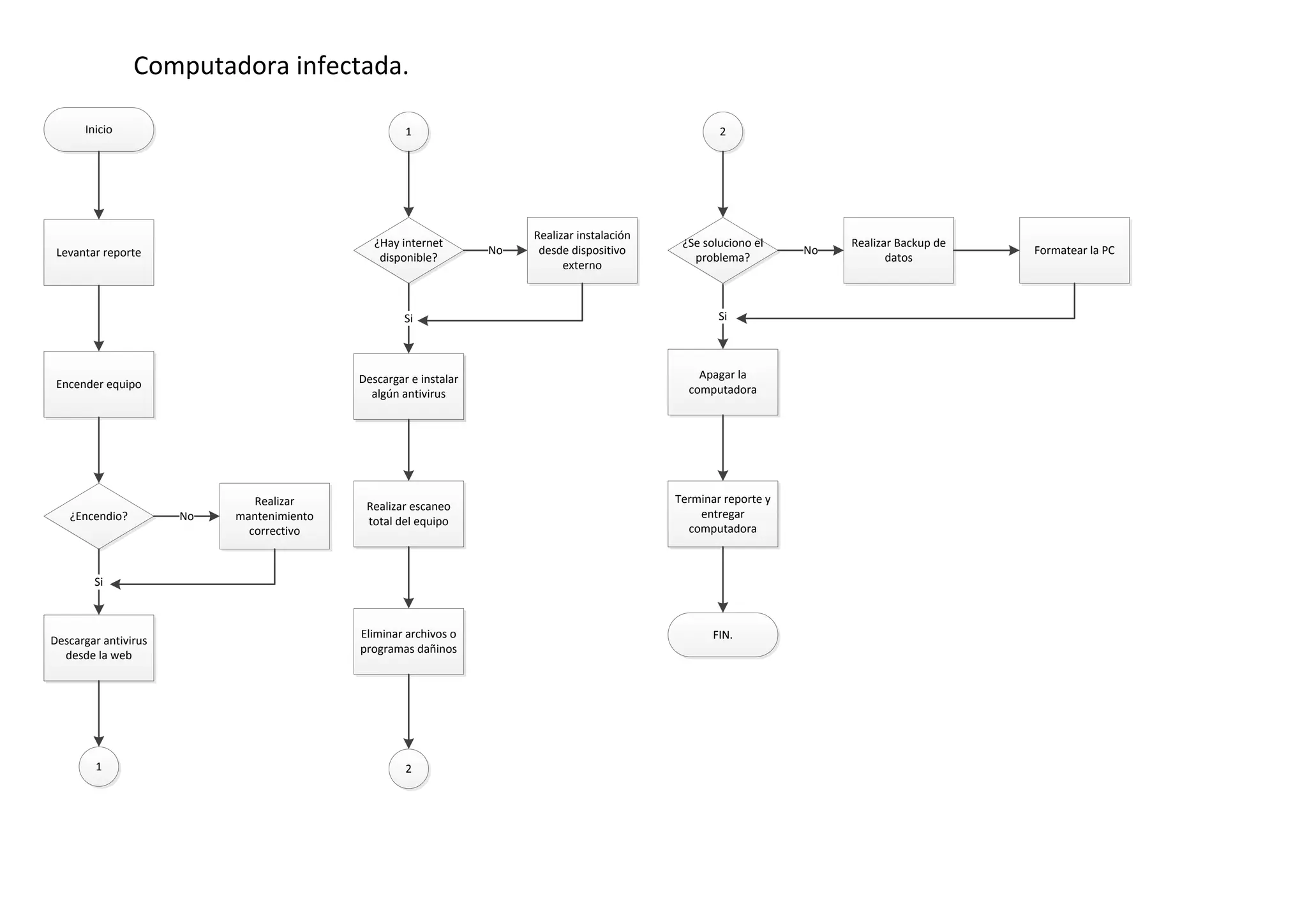 El documento describe los pasos a seguir para desinfectar una computadora infectada, incluyendo levantar un reporte, descargar un antivirus si hay internet disponible, instalarlo desde un dispositivo externo de lo contrario, escanear la computadora, eliminar archivos dañinos, y formatearla si el problema no se resolvió.