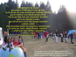 Este documento presenta un resumen del mensaje de Jesús sobre el divorcio y la igualdad entre hombres y mujeres. Jesús dice que Dios creó originalmente al hombre y la mujer iguales, por lo que el divorcio va en contra de la voluntad de Dios. Jesús también bendice a los niños y dice que el Reino de Dios pertenece a aquellos que son como ellos: humildes, abiertos y confiados.