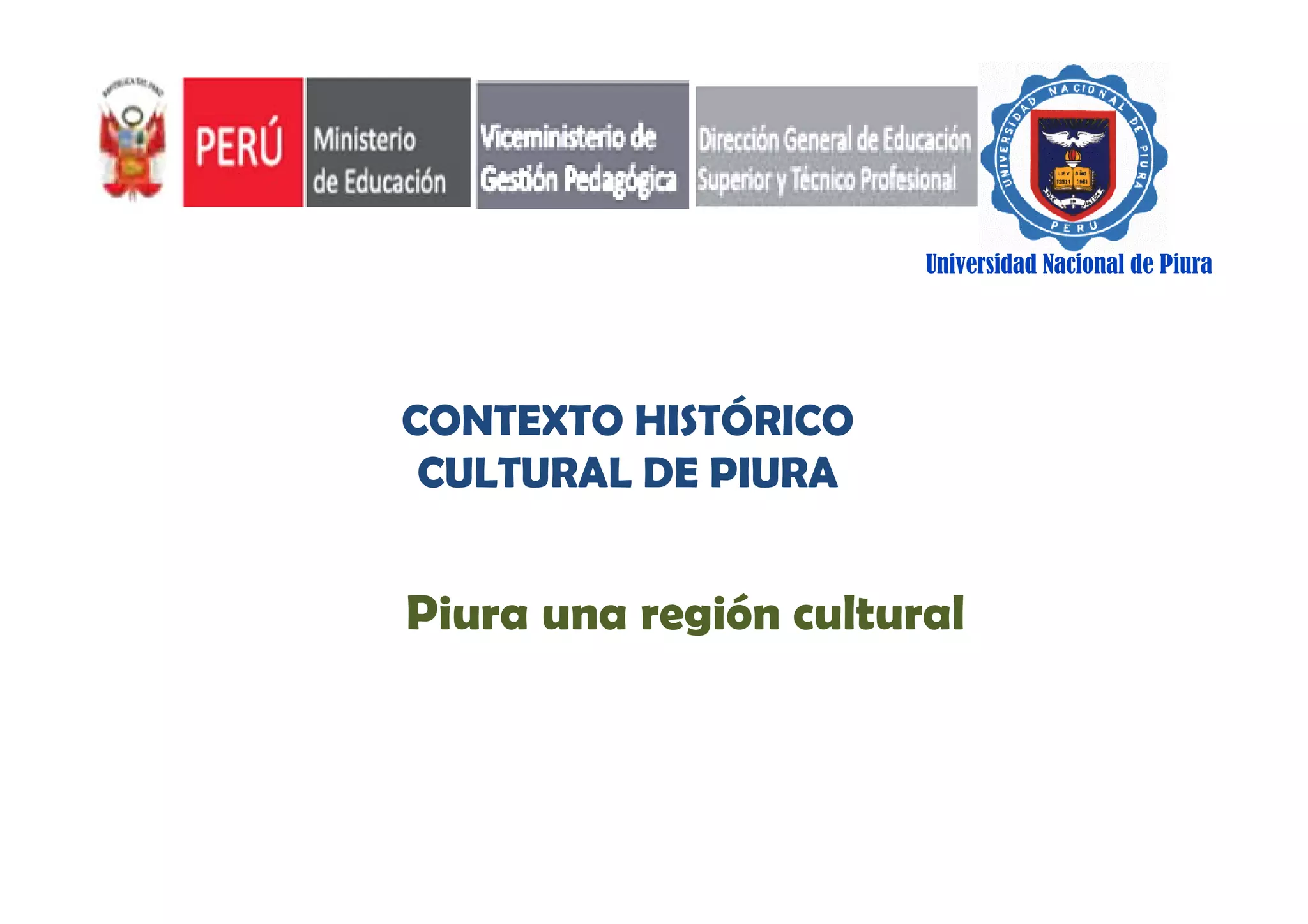 Este documento describe el contexto histórico-cultural de la región de Piura en el norte del Perú. Explica que la región se formó a partir de la combinación única de mar, desierto y ríos, y que los primeros grupos humanos habitaron la región desde aproximadamente 9500 a.C. A lo largo de la historia, diferentes grupos étnicos como los Vicús, Tallanes y Guayacundos habitaron la región y desarrollaron su propia cultura, aunque también recibieron influencias de otras culturas. La región ha