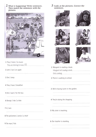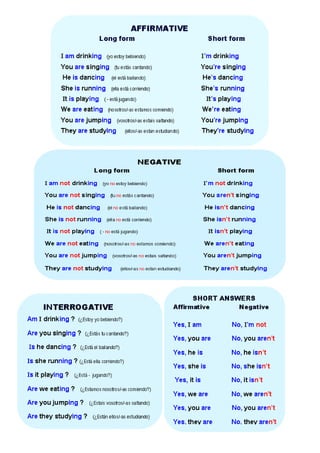 Este documento proporciona instrucciones sobre cómo formar el presente continuo en inglés. Explica que el presente continuo se forma con el verbo "to be" en su forma correspondiente (am, is, are) más el verbo principal con la terminación "-ing". Luego detalla las reglas para añadir la terminación "-ing" a los verbos, incluyendo verbos que terminan en vocal+consonante o consonante+vocal+consonante. Finalmente, da ejemplos de oraciones en presente continuo y ejercicios para practicar.
