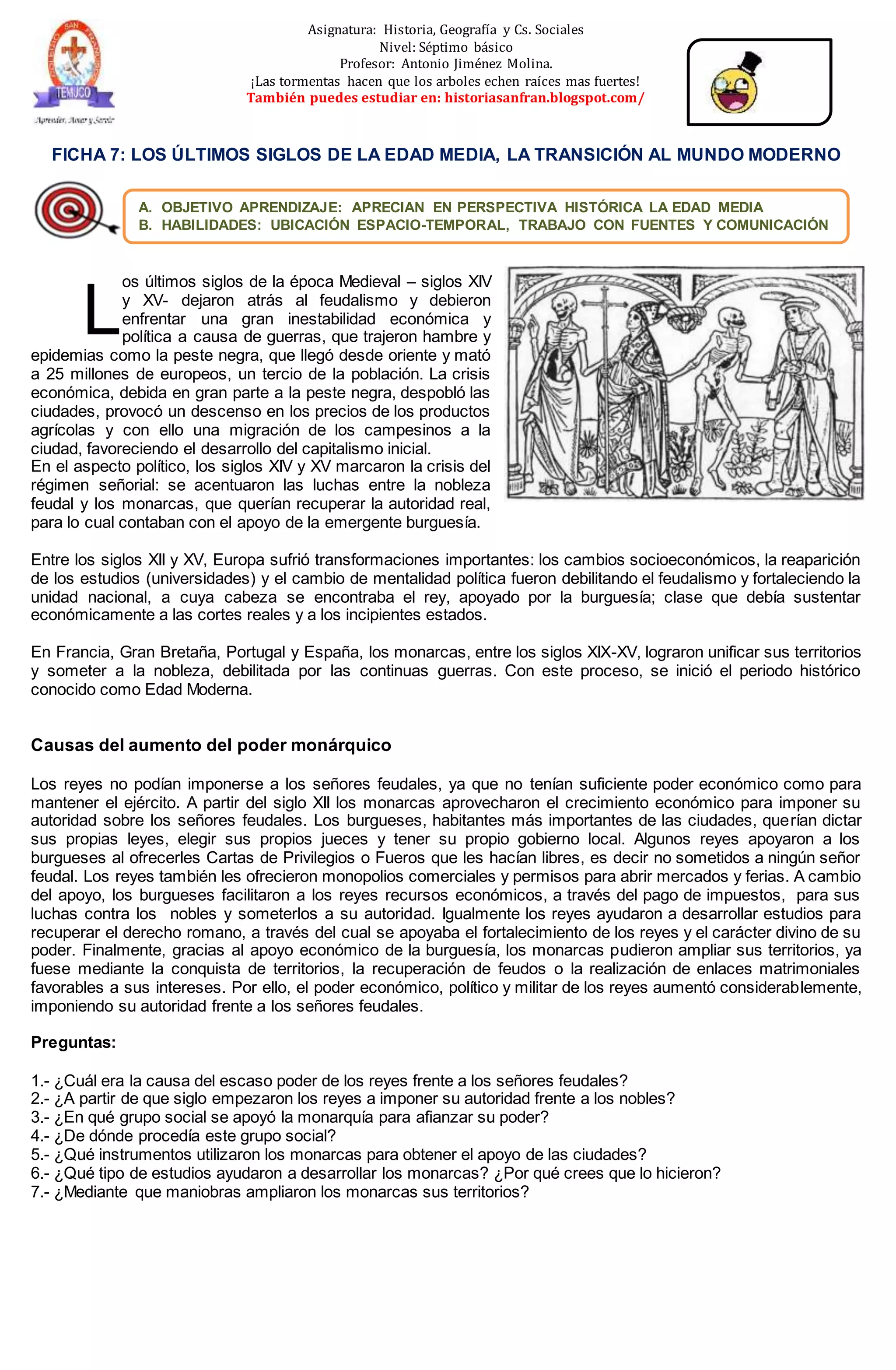 El documento resume los últimos siglos de la Edad Media en Europa. La peste negra y las guerras causaron una gran inestabilidad económica y política, mientras que los monarcas buscaban consolidar su poder frente a la nobleza feudal con el apoyo de las ciudades emergentes. Los reyes otorgaron privilegios a los burgueses a cambio de apoyo económico para someter a los señores feudales, marcando el inicio del periodo conocido como Edad Moderna.
