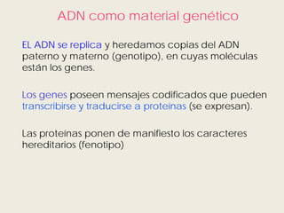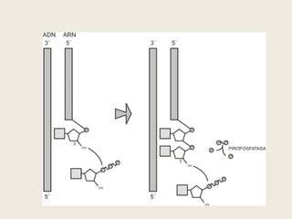 La transcripción es el proceso por el cual la información genética almacenada en el ADN se copia en ARN mensajero (ARNm). En los procariotas, una sola ARN polimerasa sintetiza ARNm policistrónico, mientras que en los eucariotas tres ARN polimerasas sintetizan ARNm monocistrónico que requiere maduración postranscripcional para eliminar intrones y añadir una cola poli-A y caperuza. La información fluye del ADN al ARNm y luego a proteínas.