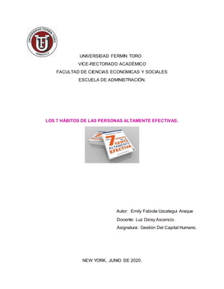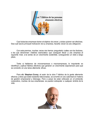 El documento presenta un análisis de los '7 hábitos de las personas altamente efectivas' de Stephen Covey, destacando su importancia en el crecimiento y efectividad organizacional. Se clasifican los hábitos en 'victoria privada' y 'victoria pública', que abarcan desde la proactividad y establecimiento de metas hasta la sinergia y la importancia del desarrollo personal. La obra, aclamada mundialmente, es fundamental para quienes buscan mejorar sus habilidades y alcanzar sus objetivos tanto en la vida personal como profesional.