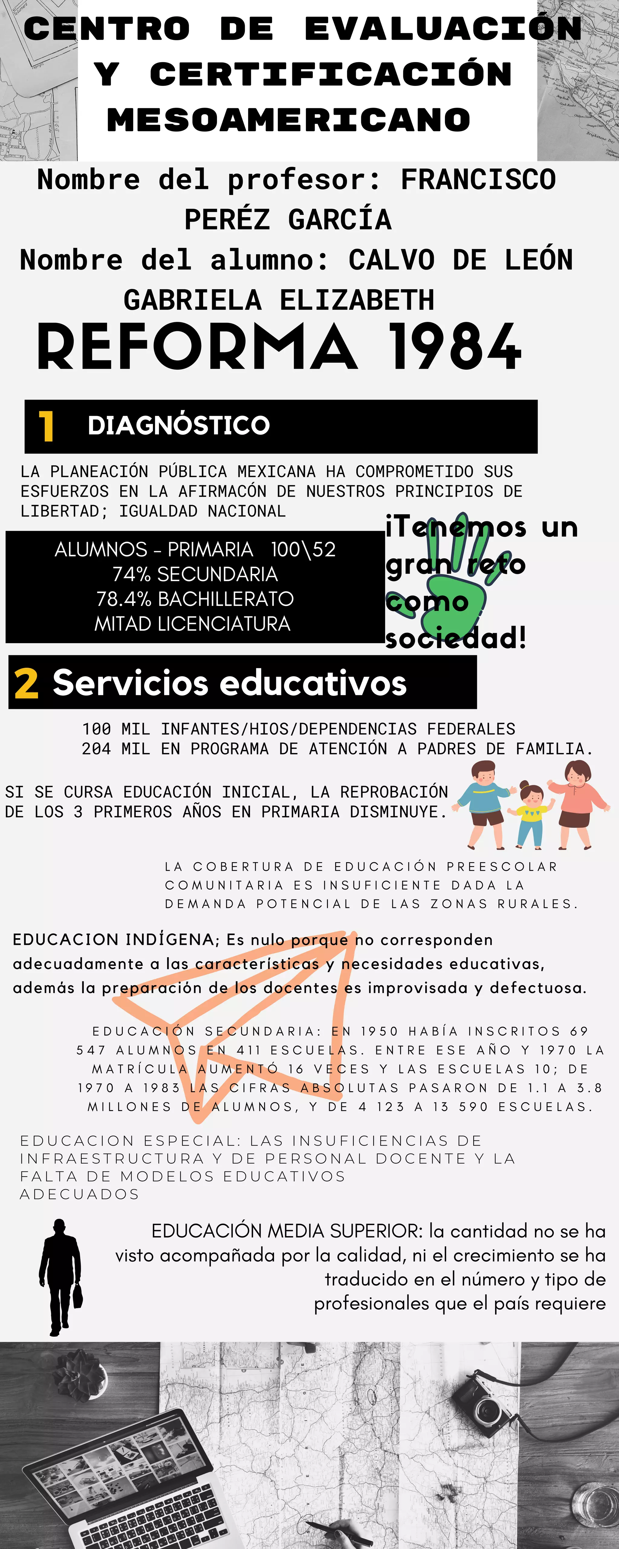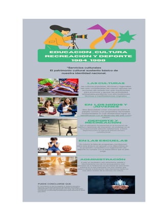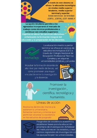Este documento discute varios temas relacionados con la educación en México. Resalta la necesidad de elevar la calidad de la educación a través de mejorar la formación de maestros, revisar los programas educativos y reducir el fracaso escolar. También enfatiza la importancia de racionalizar los recursos y ampliar el acceso a la educación, con enfoque en zonas y grupos desfavorecidos. Finalmente, destaca la importancia de vincular la educación con la investigación científica para apoyar el desarrollo