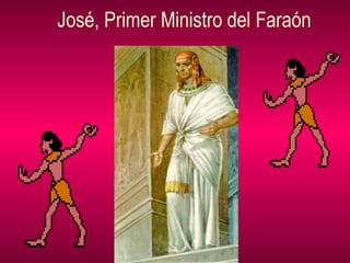 1) José, el hijo favorito de Jacob, es vendido como esclavo por sus hermanos celosos y llevado a Egipto. 2) Allí, José se convierte en un alto funcionario gracias a su habilidad para interpretar sueños y evita una hambruna al almacenar grano durante los años abundantes. 3) Años más tarde, cuando sus hermanos viajan a Egipto durante la hambruna, José los reconoce pero no se revela, aunque finalmente se reúne con su familia.