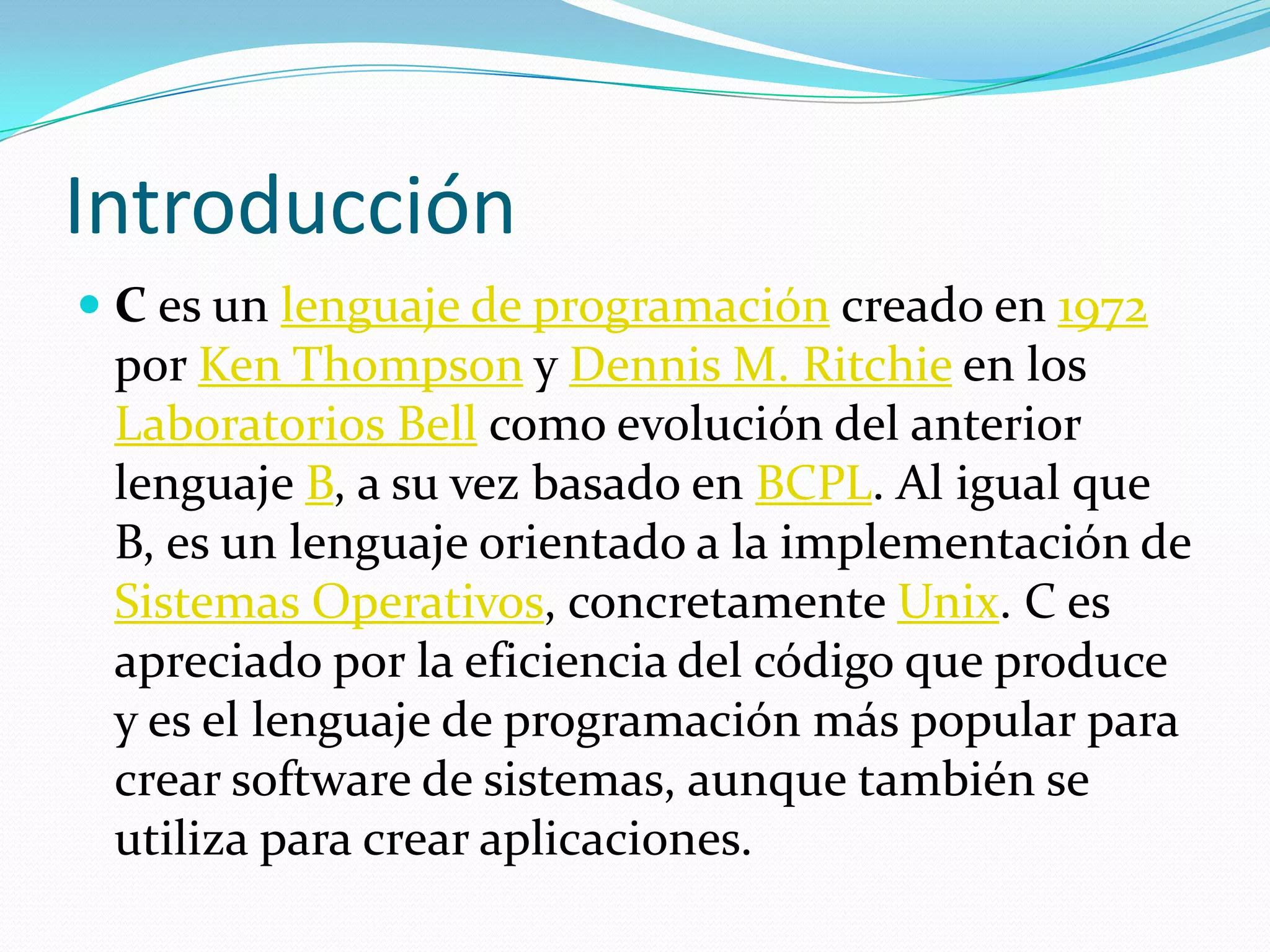 C es un lenguaje de programación creado en 1972 para la creación de sistemas operativos como Unix. Es apreciado por su eficiencia y es popular para crear software de sistemas. Un programa en C consiste en funciones, incluyendo la función principal main(), y cada función tiene una estructura definida con declaraciones y sentencias. Los programas se compilan en código de máquina ejecutable usando un compilador y enlazador.