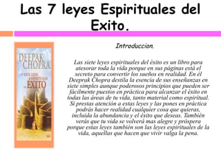 Este documento resume las 7 leyes espirituales del éxito descritas en el libro de Deepak Chopra. Estas leyes incluyen la ley de la potencialidad pura, la ley de dar, la ley del karma o causa y efecto, la ley del menor esfuerzo, la ley de la intención y el deseo, la ley del desapego, y la ley del dharma o propósito en la vida. Siguiendo estas leyes, una persona puede alcanzar el éxito en todas las áreas de su vida.