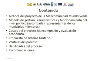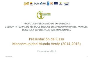 El documento presenta el caso de la Mancomunidad Mundo Verde, un modelo integral de gestión de residuos sólidos en Ecuador, que abarca 20 cantones y una población de 1 millón de habitantes. Se discuten diagnósticos sobre la situación actual del manejo de residuos, así como costos, beneficios y un sistema tarifario propuesto que busca optimizar la recolección y tratamiento de residuos. Además, se destacan las ventajas de un enfoque mancomunado que permite un manejo más eficiente y sostenible en comparación con sistemas individuales.