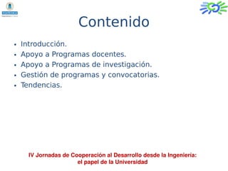 Este documento resume el papel de las áreas de cooperación al desarrollo en las universidades españolas, tomando como ejemplo la Universidad Politécnica de Madrid (UPM). Explica que la UPM apoya programas docentes y de investigación relacionados con la cooperación, y gestiona programas y convocatorias como subvenciones, proyectos de fin de carrera y voluntariados. También describe la creación de grupos de cooperación en la UPM y planes para establecer un Centro de Innovación en Tecnologías para el Desarrollo