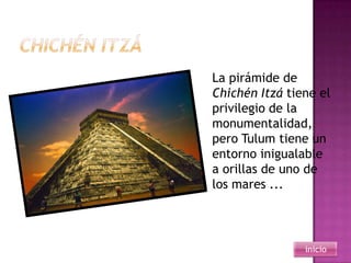 Este documento presenta breves descripciones de 7 de las maravillas del mundo: la pirámide de Chichén Itzá en México, el Coliseo Romano en Roma, la estatua Cristo Redentor en Río de Janeiro, la Gran Muralla China, las ruinas de Machu Picchu en Perú, la ciudad antigua de Petra en Jordania, y el Taj Mahal en India.