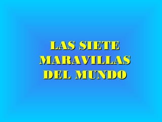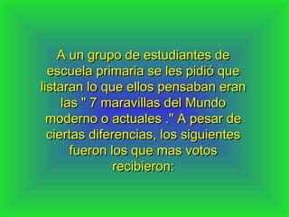 El documento presenta las siete maravillas del mundo moderno según una votación de estudiantes de primaria, incluyendo las Pirámides de Egipto, el Taj Mahal y la Gran Muralla China. Sin embargo, una niña no pudo decidir su lista y en su lugar propuso que las verdaderas maravillas son los sentidos humanos como ver, oír, tocar, probar, sentir y reír, así como el amor.