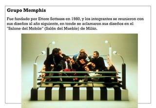 El grupo Memphis surgió en 1981 en reacción a los diseños austeros de la posguerra. Ofrecieron piezas coloridas e impactantes que contrastaban con los estilos oscuros dominantes. Se inspiraron en movimientos como el Art Deco y el Pop Art, con el objetivo de sustituir al Estilo Internacional.