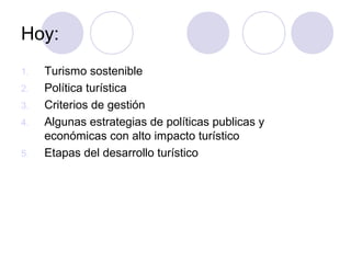 El documento describe los modelos de gestión turística sostenible y las estrategias de política turística. Explica las cinco etapas del desarrollo turístico, incluyendo realizar inventarios de recursos, investigar mercados, posicionar estratégicamente el destino turístico, implementar el plan estratégico y monitorear los resultados de manera continua. También discute la importancia de coordinar las políticas turísticas con otras políticas públicas y económicas para lograr un desarrollo sostenible.