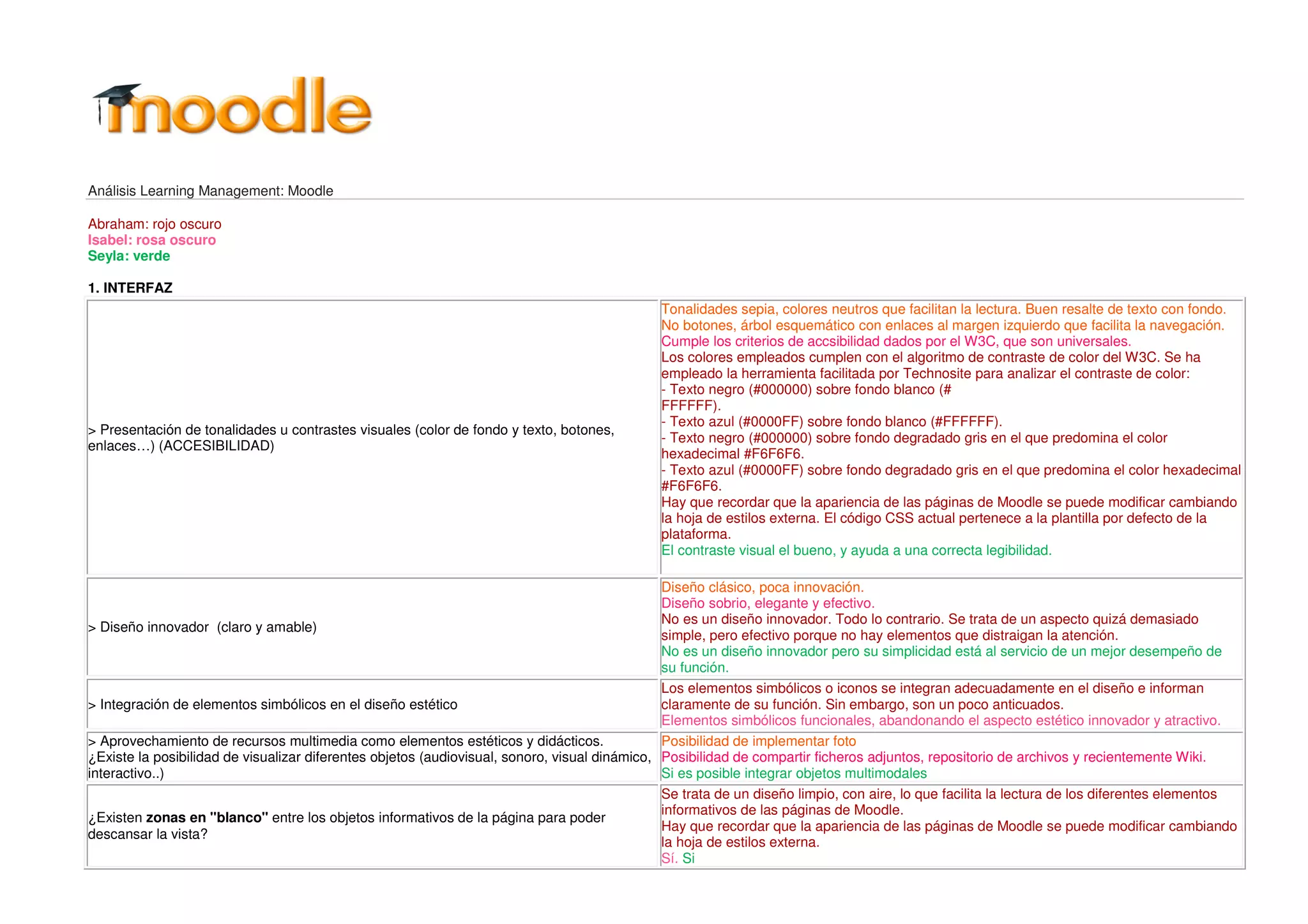 Este documento analiza la interfaz de usuario y la interactividad de la plataforma de aprendizaje Moodle. En cuanto a la interfaz, Moodle cumple con los estándares de accesibilidad del W3C y utiliza colores y contrastes legibles. Si bien su diseño no es innovador, es funcional y limpio. Respecto a la interactividad, Moodle ofrece un segundo nivel que permite la navegación a través de enlaces y también evaluar el desempeño de los usuarios.