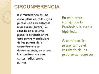 Este documento presenta información sobre diferentes figuras geométricas como la circunferencia, parábola e hipérbola. Define la circunferencia como una curva cerrada cuyos puntos están equidistantes de un centro. Explica que la parábola es el lugar geométrico de puntos equidistantes de una recta y un punto fijo. Finalmente, señala que la hipérbola es una curva compuesta de dos ramas simétricas donde la diferencia de distancias a dos puntos fijos es constante. Incluye bocet
