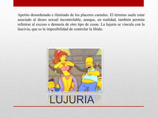 Los 7 pecados capitales son: lujuria (apetito desordenado de placeres carnales), gula (apetito desmedido por la comida y bebida), avaricia (afán excesivo de poseer riquezas), pereza (desgano e indiferencia), ira (furia y violencia), envidia (resentimiento por el bien ajeno), y soberbia (presunción de sentirse mejor que los demás). Estos pecados fueron codificados por el papa Gregorio Magno aunque su origen se remonta a Evagrio Póntico, no ap