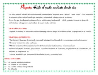 Este documento presenta un plan de actividades para el cuidado del medio ambiente dirigido a niños de primera infancia. El objetivo general es despertar el asombro y la curiosidad por las ciencias mediante actividades que fomenten la indagación sobre el medio natural. Los objetivos específicos incluyen facilitar actividades que despierten la curiosidad sobre fenómenos naturales, mostrar formas de intervención humana y sus consecuencias, y acercar actividades que promuevan el desarrollo intelectual. El plan incluye 18 subtemas con formatos de