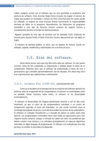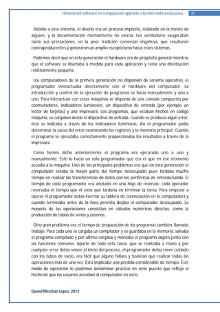 Este documento describe las diferentes eras del desarrollo del software desde los inicios de la computación hasta la actualidad. La primera era (1945-1955) se caracterizó por que el software se consideraba un complemento y se desarrollaba sin planificación, con altos costos. El software se escribía a mano en lenguaje máquina y era desarrollado y ejecutado por una sola persona. En esta era se introdujeron los primeros lenguajes simbólicos y compiladores para facilitar la programación.