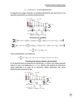 El documento presenta el análisis estructural de una viga sujeta a diferentes cargas. Se calculan las reacciones en los soportes y se determinan las funciones de corte y momento para tres tramos de la viga mediante el método de cortes. Finalmente, se calcula el momento máximo en cada tramo.