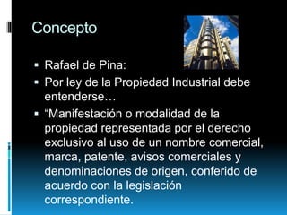 Este documento trata sobre los conceptos de propiedad industrial y derechos de autor. Explica que la propiedad industrial incluye marcas, patentes, nombres comerciales y otros derechos sobre creaciones. Los derechos de autor otorgan al creador derechos morales y patrimoniales sobre su obra. También describe los requisitos para registrar una marca y obtener una patente sobre una invención.