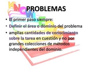 Este documento describe los tipos de problemas según su estructura, incluyendo problemas estructurados, semiestructurados y no estructurados. También discute lenguajes comunes para sistemas basados en el conocimiento como PROLOG y CLIPS. Finalmente, propone buscar un ejemplo de cómo un sistema basado en el conocimiento resolvió un problema real y agregar referencias bibliográficas y conclusiones.