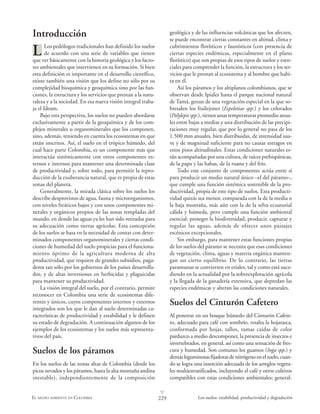 Este documento describe diferentes tipos de suelos en Colombia y los ecosistemas asociados. Resume tres tipos principales: 1) Los suelos de los páramos se caracterizan por tener vegetación especial como frailejones y colorados, y cumplen funciones ambientales como proteger biodiversidad y regular agua. 2) Los suelos del Cinturón Cafetero se encuentran en las vertientes húmedas cordilleranas y son ideales para el cultivo de café, gracias a su composición volcánica y humedad. 3) Los suelos de la