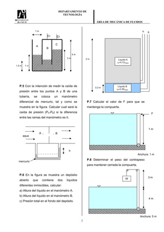 El documento presenta 12 problemas de mecánica de fluidos relacionados con presiones, fuerzas y equilibrio en sistemas que contienen líquidos y gases. Los problemas involucran tanques, tuberías, manómetros, compuertas y estructuras sumergidas en agua, y piden calcular presiones, fuerzas, alturas y pesos para determinar estados de equilibrio.
