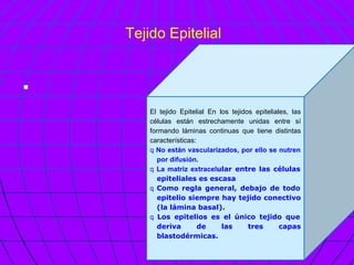 Este documento resume los principales tipos de tejidos: epitelial, conjuntivo, cartilaginoso, óseo, sanguíneo, muscular y nervioso. Describe brevemente las características fundamentales de cada tejido, incluyendo su composición celular, función y estructura.