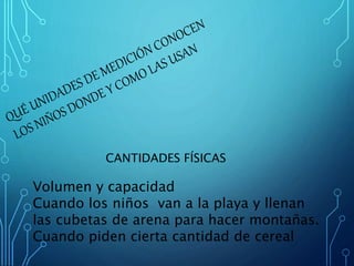 El documento describe diferentes tipos de cantidades físicas y no físicas con las que los niños en edad preescolar están familiarizados en su vida cotidiana, como volumen, peso, longitud, dinero y tiempo. Explica que los niños usan su intuición y comparaciones visuales para entender estas cantidades antes de aprender mediciones exactas, y que esta experiencia previa es el punto de partida para que los maestros los ayuden a sistematizar y conceptualizar sus conocimientos sobre la medición.