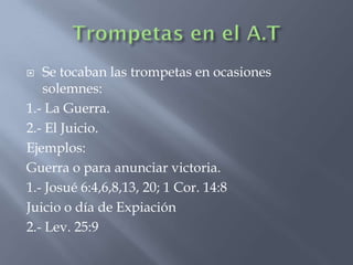 Las 7 trompetas del Apocalipsis se refieren a juicios históricos de Dios contra la opresión y la corrupción de la verdad a lo largo de la historia. La primera trompeta simboliza la destrucción de Jerusalén por los romanos en el año 70 d.C. Las siguientes trompetas representan otros eventos históricos como las invasiones bárbaras y la Edad Media, hasta la Reforma Protestante y la Revolución Francesa.