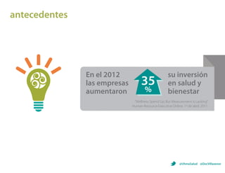 El documento describe los problemas de salud relacionados con el estilo de vida en México, como la obesidad y la diabetes, y propone que las empresas inviertan más en programas de bienestar para los empleados como una solución. Estos programas podrían incluir actividades como yoga, masajes, conferencias de salud y campañas de vacunación. Los datos muestran que las empresas más grandes ya invierten en la salud de los empleados, pero todavía hay oportunidad para expandir estos programas a más compañías. Los beneficios potenciales incluy