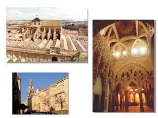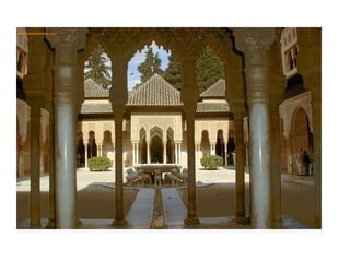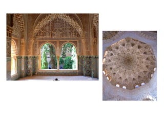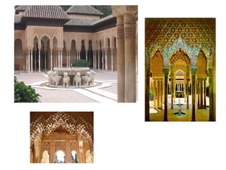 El documento resume el contexto histórico y las características principales del arte islámico. Explica que surgió bajo el Imperio Islámico que controló gran parte de Oriente Medio y el norte de África, y prohibió la representación humana. El arte islámico se caracteriza por el uso del arco, la decoración geométrica y epigráfica, y se expresó principalmente a través de la arquitectura civil y religiosa, especialmente las mezquitas.