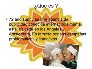 72 and sunny es una agencia de publicidad internacional con sedes en Los Ángeles y Ámsterdam conocida por sus campañas atrevidas y llamativas. La agencia ha trabajado para marcas como Nike, HBO, Samsung y empresas de implementación para crear campañas para clientes que incluyen a Nike, Bugaboo, HBO, Hardee's, Activision, Discovery Channel y más.