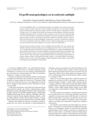 La Esclerosis Múltiple (EM) es una enfermedad del Sistema Nervioso Central que se caracteriza por una progresiva desmielinización y suele afectar a la sustancia blanca en el cerebro y la médula espinal. El objetivo de este estudio fue examinar el perfil neuropsicológico de 80 personas con diagnóstico de EM y compararlo con el de 40 sujetos sanos. Las personas con EM mostraron un desempeño significativamente más bajo en pruebas de velocidad de procesamiento, memoria de trabajo, atención