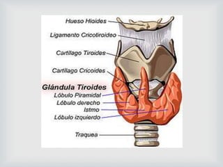 Este documento resume diferentes aspectos de la glándula tiroides, incluyendo su anatomía, funciones, tipos de hipertiroidismo e hipotiroidismo, tratamientos, tiroiditis y nodulos tiroideos. Describe las características generales de la tiroides, sus acciones biológicas, las causas y clasificaciones del hipertiroidismo y hipotiroidismo, así como sus tratamientos. También explica los tipos de tiroiditis agudas y crónicas, y los factores de riesgo, diagnóstico y pronóst