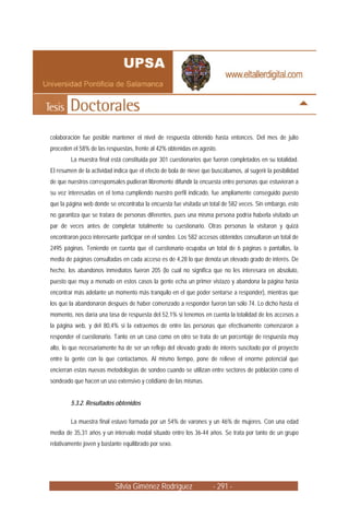 El documento describe los resultados de una encuesta electrónica sobre el conocimiento de la hipótesis no vírica del SIDA. Aproximadamente la mitad de las respuestas fueron devueltas por direcciones de correo electrónico incorrectas. La encuesta obtuvo 301 respuestas completas de personas interesadas en el tema del SIDA, principalmente residentes en Madrid. Los resultados mostraron que el 54% de los encuestados eran hombres y el 46% mujeres, con una edad promedio de 35 años y un alto nivel educativo, especialmente entre las mujeres.