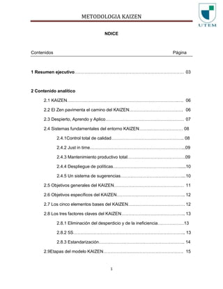 El documento describe la metodología Kaizen de mejora continua. Explica que Kaizen se originó en Japón después de la Segunda Guerra Mundial para ayudar a las empresas a mejorar de forma gradual. Se basa en la filosofía zen de mejorar cada día un poco. requiere la participación de todos los empleados para identificar y eliminar desperdicios. El objetivo final es mejorar la calidad, productividad y competitividad de una organización de manera armónica y sostenida en el tiempo.