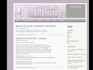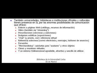 El documento presenta herramientas de colaboración como wikis, redes sociales y mundos virtuales aplicadas a las bibliotecas, resaltando su papel en la mejora de la comunicación interna y externa. Se discuten las ventajas y desventajas de estas herramientas, así como ejemplos concretos de su uso en el ámbito bibliotecario. Además, se enfatiza la necesidad de adaptación por parte de los usuarios y el personal a las nuevas tecnologías.