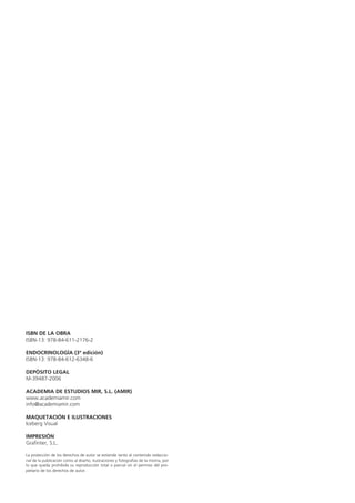 Este documento proporciona información sobre un libro de endocrinología, incluyendo los ISBN, autores, editorial y contenido general. El libro consta de 13 temas que cubren las principales glándulas endocrinas y sus patologías más comunes, con énfasis en la fisiología del hipotálamo y la hipófisis, y trastornos de la tiroides, suprarrenales, metabolismo de los carbohidratos y calcio. El documento también lista los autores y sus afiliaciones hospitalarias.