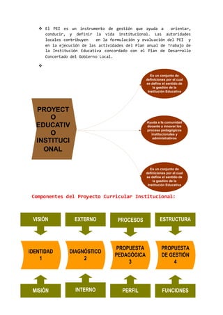 El documento explica lo que es el Proyecto Curricular Institucional (PCI). El PCI es un instrumento de planificación estratégica de mediano plazo para las instituciones educativas. Se compone de cuatro componentes: identidad, diagnóstico, propuesta pedagógica y propuesta de gestión. El PCI ayuda a orientar y definir la vida institucional y a innovar los procesos pedagógicos.