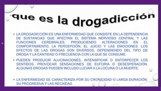 La drogadicción es considerada una enfermedad porque presenta síntomas claros como la dependencia de sustancias, la tolerancia y los síndromes de abstinencia. Se caracteriza por ser crónica y progresiva, y puede afectar las funciones cerebrales y el comportamiento de la persona, llevándola a priorizar la droga por encima de otras responsabilidades.