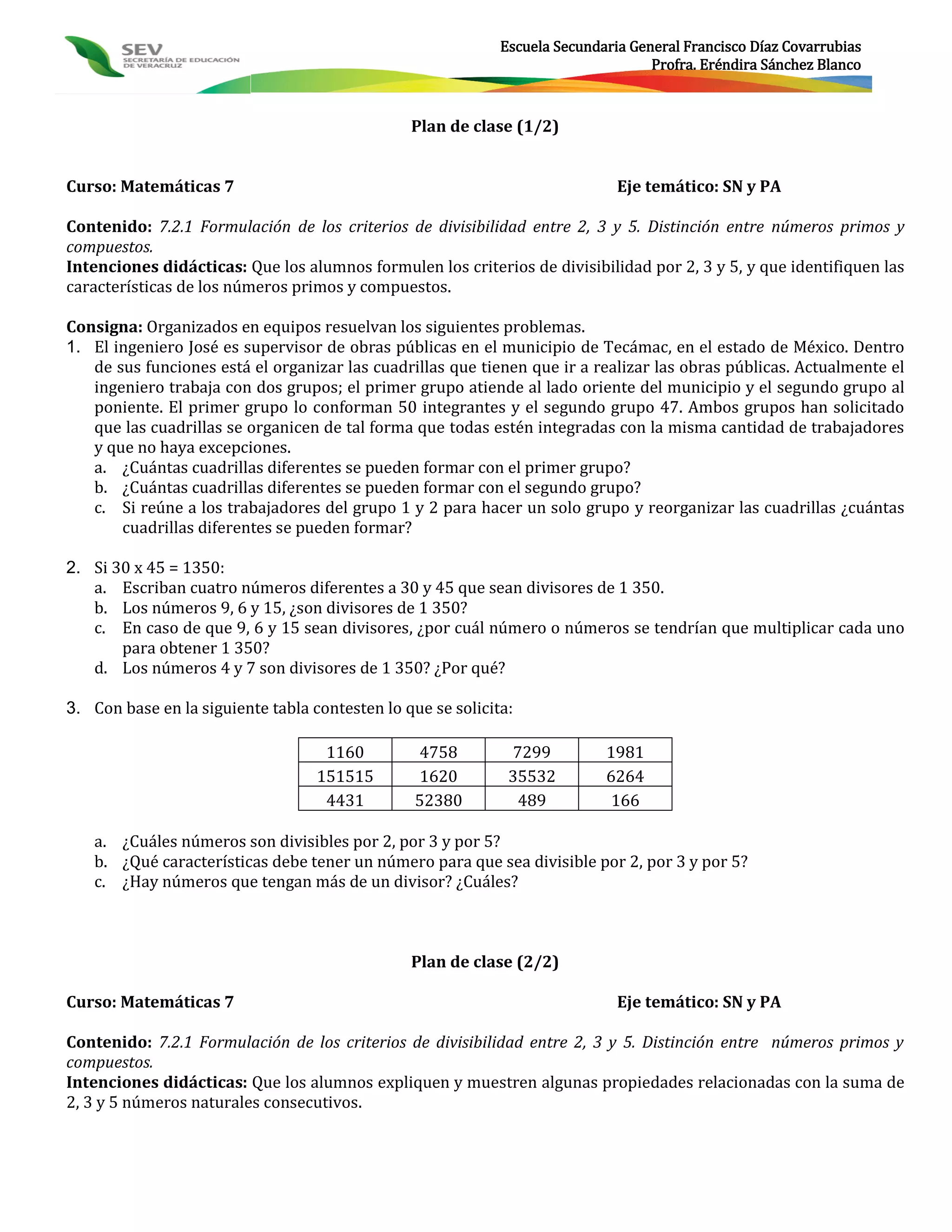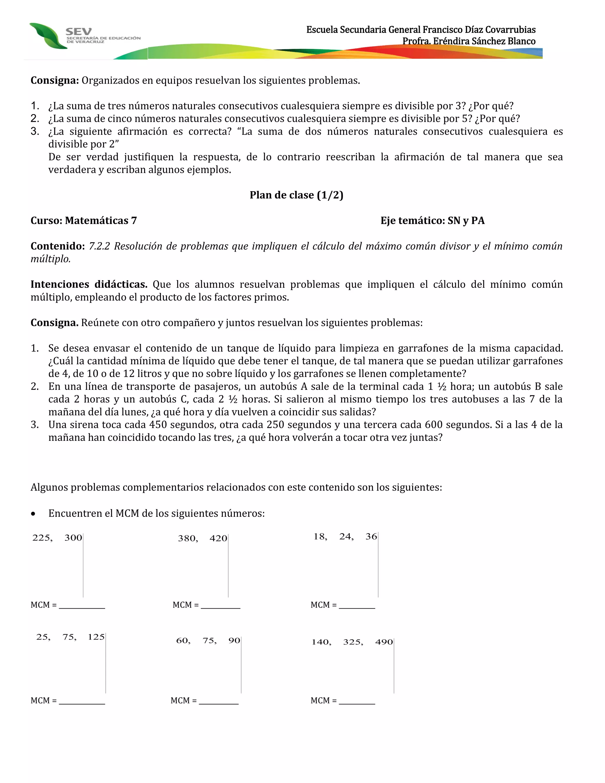 Este documento presenta el plan de clase de una profesora de matemáticas para la secundaria. El plan incluye tres sesiones y se enfoca en los criterios de divisibilidad, cálculo del máximo común divisor y mínimo común múltiplo, y resolución de problemas con números fraccionarios y decimales. La profesora asigna varios problemas a grupos de estudiantes para que los resuelvan. Los problemas involucran aplicar conceptos como divisibilidad, MCD, MCM y operaciones con fracciones y decimales. El plan también incluye
